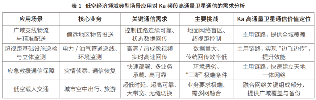 低空经济领域典型场景应用对Ka频段高通量卫星通信的需求分析见表1