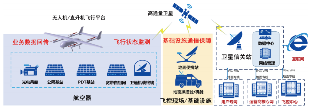 无人机/直升机部署Ka频段高通量机载卫通终端,实时传输低空飞行器的定位、飞行姿态、健康状态等关键遥测数据,保障飞行安全。