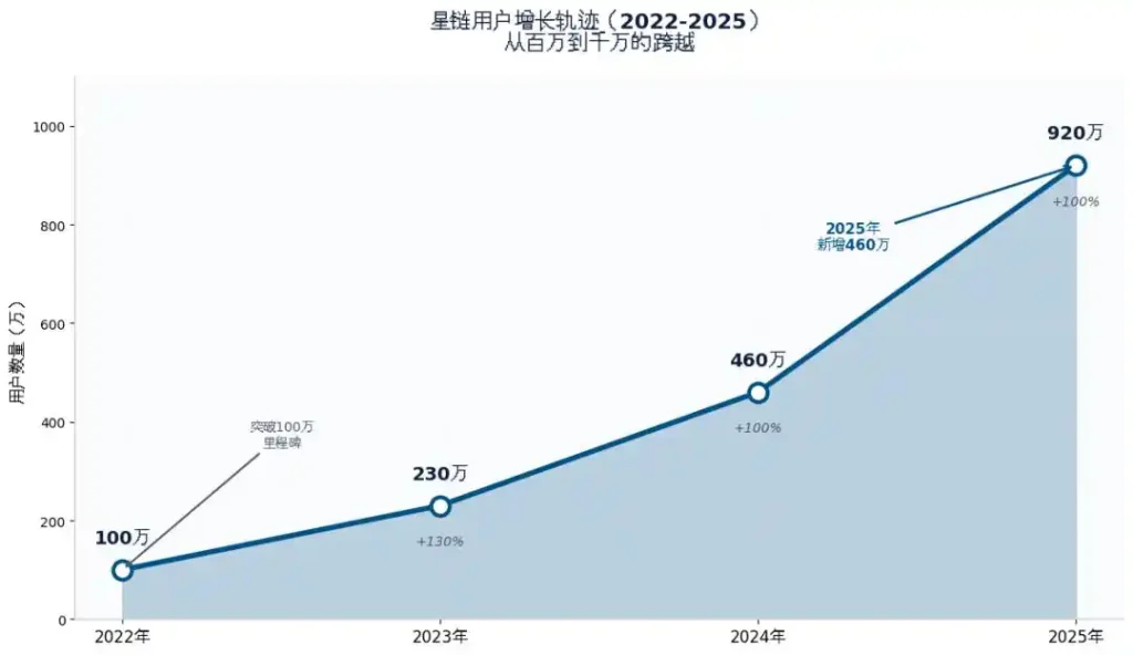回望增长轨迹,星链的扩张速度堪称惊人:2022年用户仅100万,2023年翻倍至200万,短短三年时间,用户规模接近千万量级,增长曲线几乎呈现垂直上升的态势。